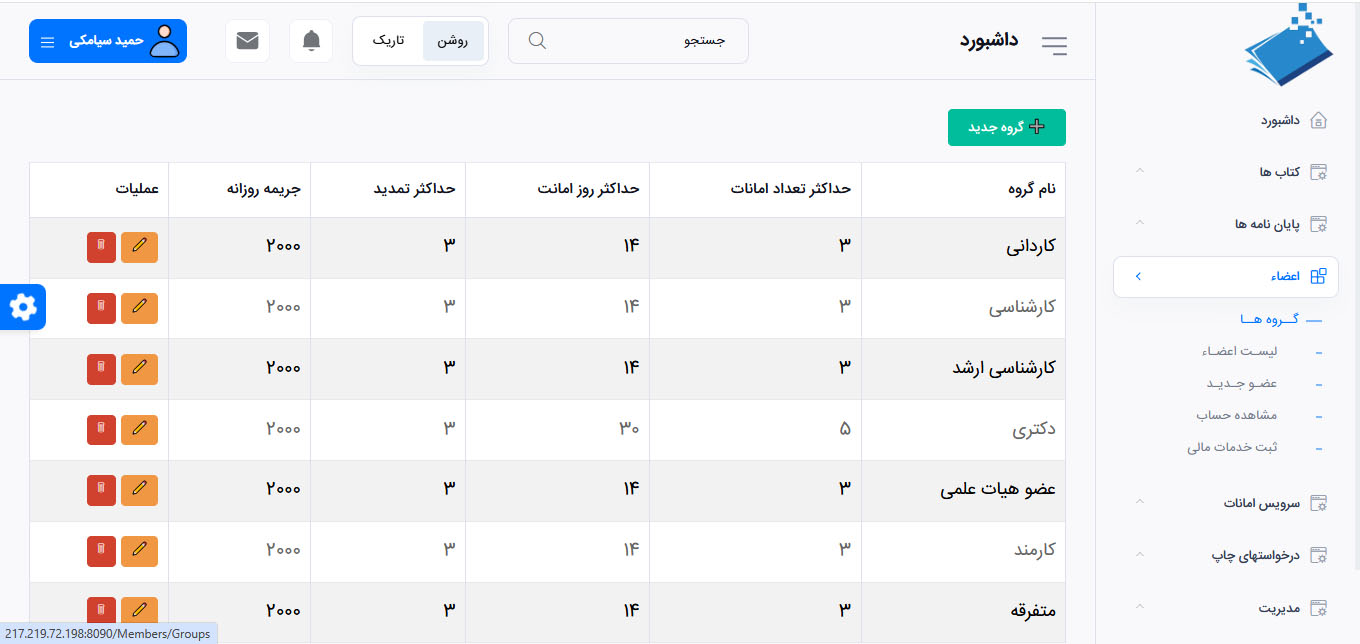 • تنظیم پارامترهای هر گروه مثل تعداد امانت ،جریمه روزانه ،دفعات تمدید و ...