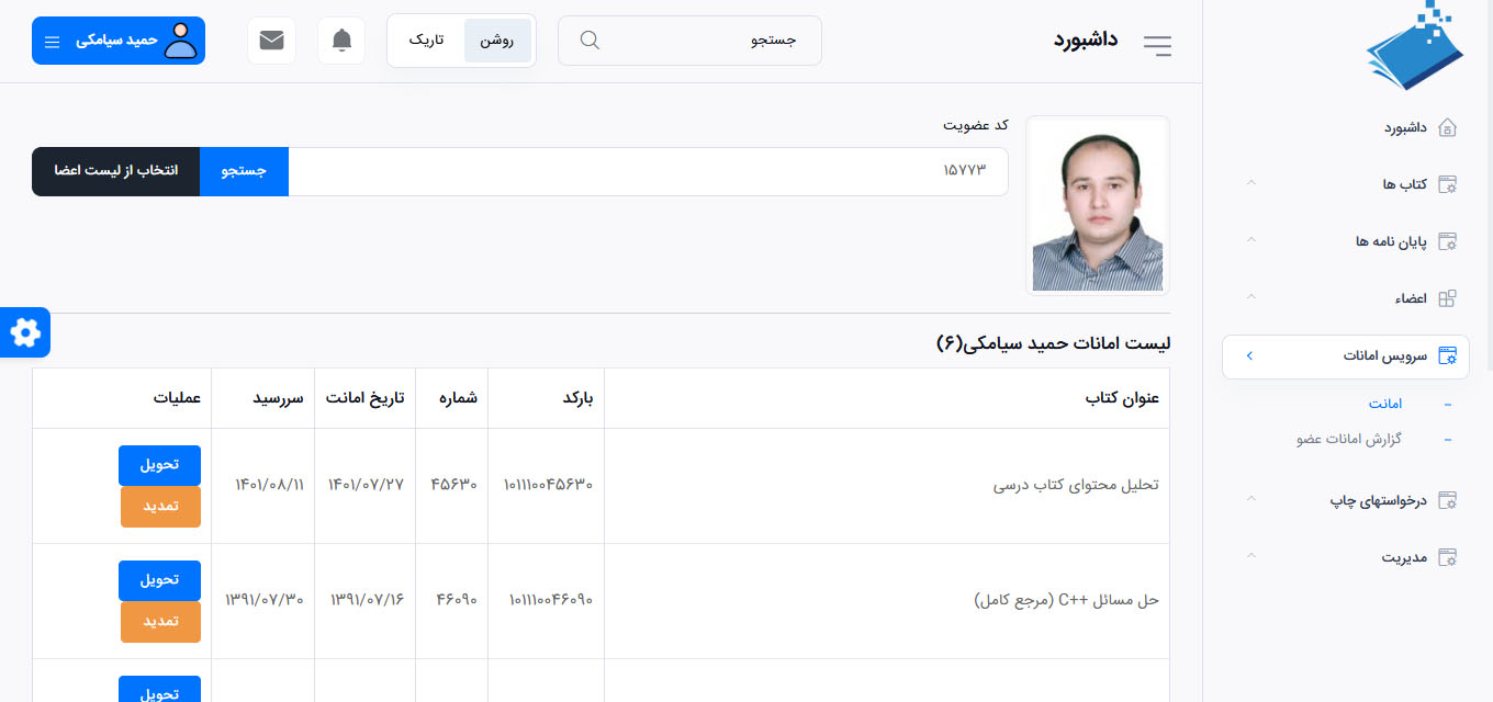 • ثبت سریع امانت و بازگشت کتاب با بارکد و یا شناسه کتاب